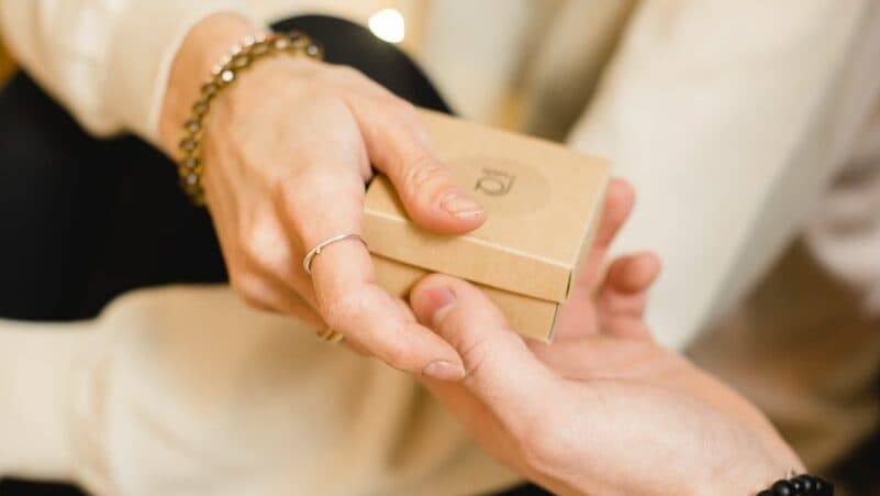 two characters exchanging gifts